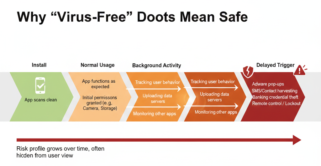 This is sometimes referred to as “sleeper behavior,” where harmful actions occur long after installation. Antivirus tools are not designed to detect intent, only known signatures.