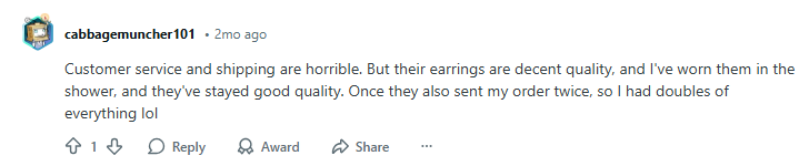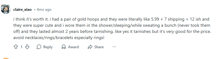 One user described 5.99 gold hoops plus shipping that lasted nearly two years of constant wear before tarnishing, and felt the quality was fair for the low price, though they advised skipping necklaces, bracelets, and rings.