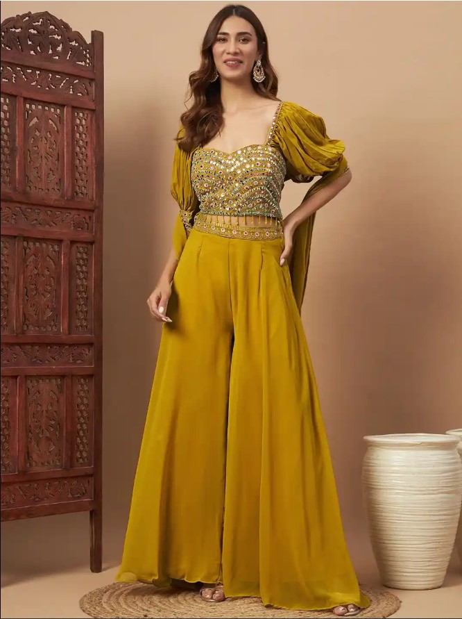 Indo-Western Palazzo-Crop Top Set Pair a flowy palazzo with a mirror-embroidered crop top. This fusion choice is made for the bride who lives for a contemporary spin on classics.