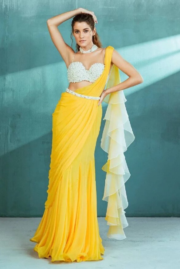 Sequined Ruffle Saree An organza ruffle saree, sprinkled with sequins, is fiercely modern but easy to move in. Perfect for those Insta-worthy candid photos.