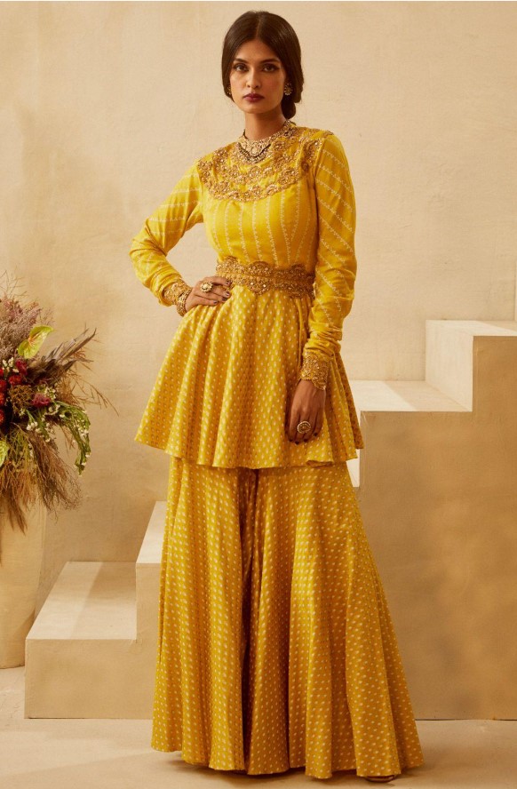 Peplum Gharara Amp up the drama with a mustard silk peplum gharara set, embellished with gota work. The layered silhouette flatters all figures and feels vintage yet fresh.