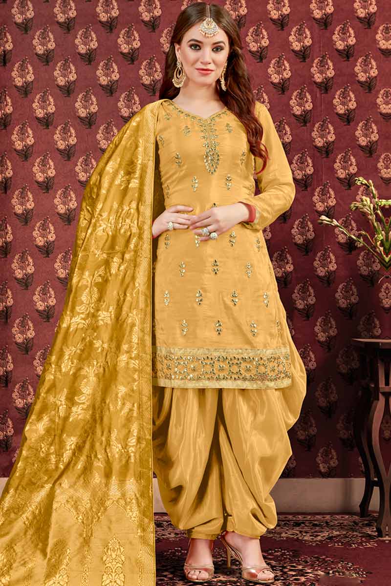 Patiala Suit A classic yellow Patiala suit, with its easy volume and grace, raises comfort to high style—especially when offset with floral jewelry.
