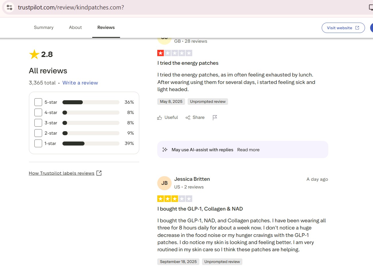 As of Sept 2025, Kind Patches shows an average 2.8/5 TrustScore from 3,365 reviews.