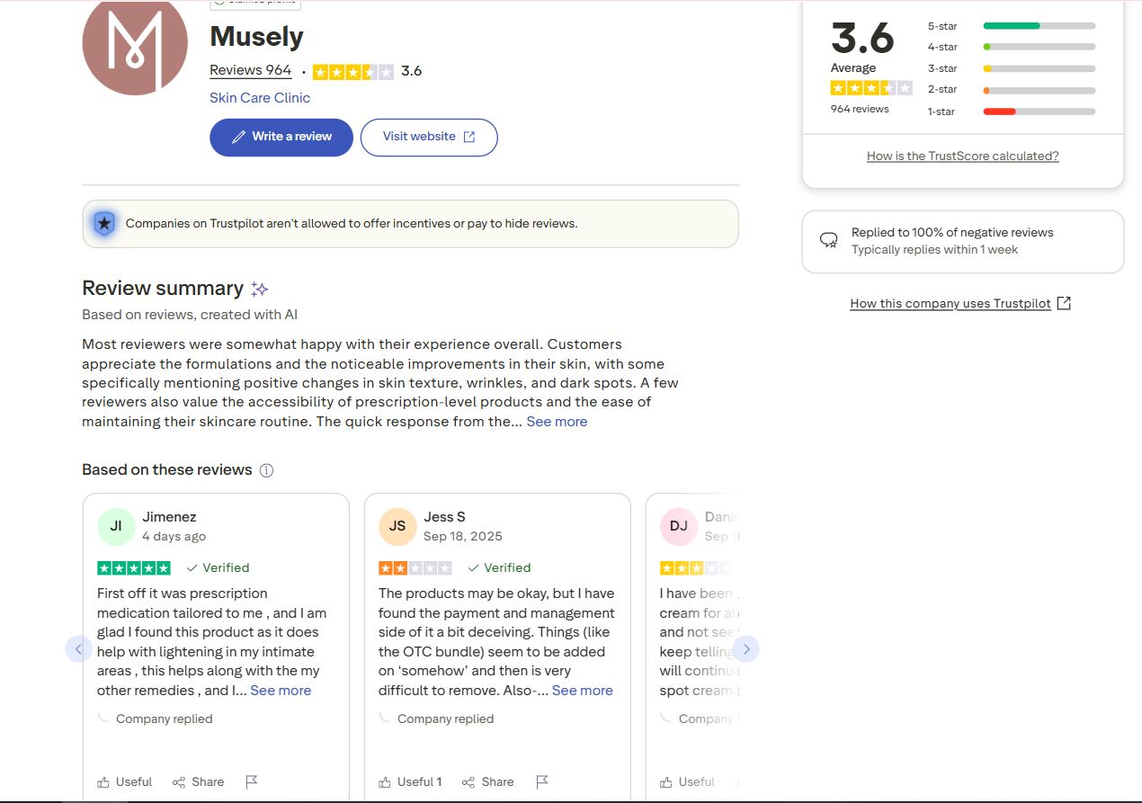 Musely is a disruptive tele-dermatology platform that delivers real value for many. While Musely claims to deliver affordable, dermatologist-guided, prescription-grade skincare to your doorstep, but is not without its shortcomings, as can be seen on various real user review sites. While some users praise its game-changing results, others decry scripted formulas, poor customer service, and even shady online practices.