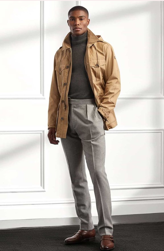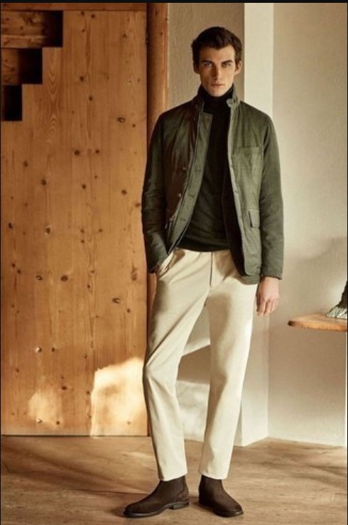Channel classic horse-race vibes with beige chinos, a navy turtleneck, and a quilted jacket. Add leather riding boots or dress shoes; perfect for museum visits or sporting events where subtlety shines.
