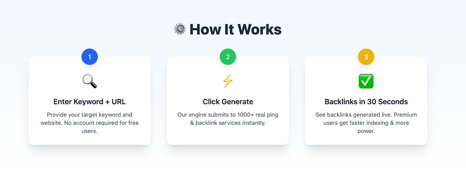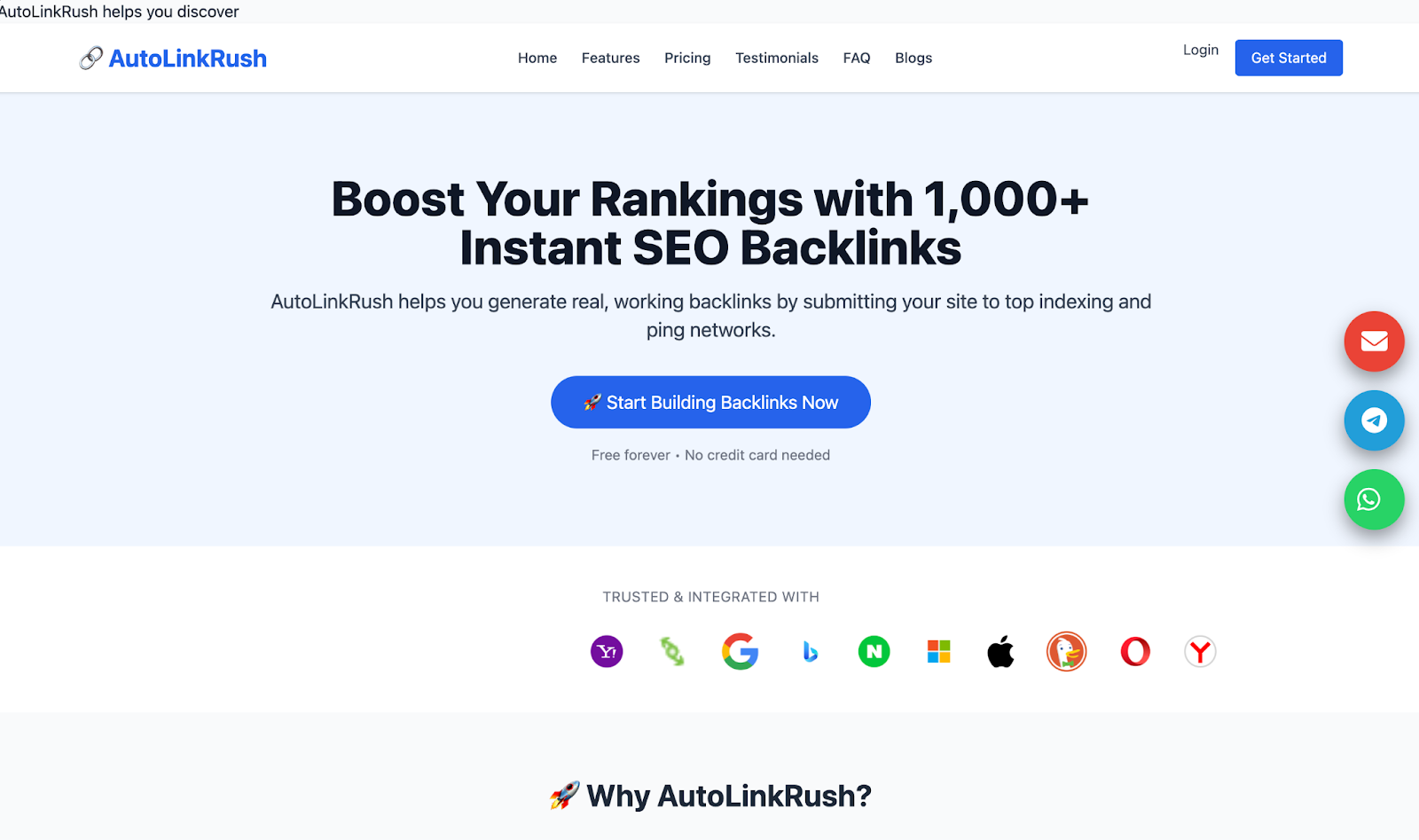 According to its homepage, AutoLinkRush.com helps users “boost rankings with 1,000+ instant SEO backlinks”. The tool promotes real-time submissions, keyword targeting, and no software installation. It positions itself as an instant indexing engine, not an outreach platform, and uses ping and backlink networks connected to major search platforms like Google, Bing, Yahoo, and Yandex.