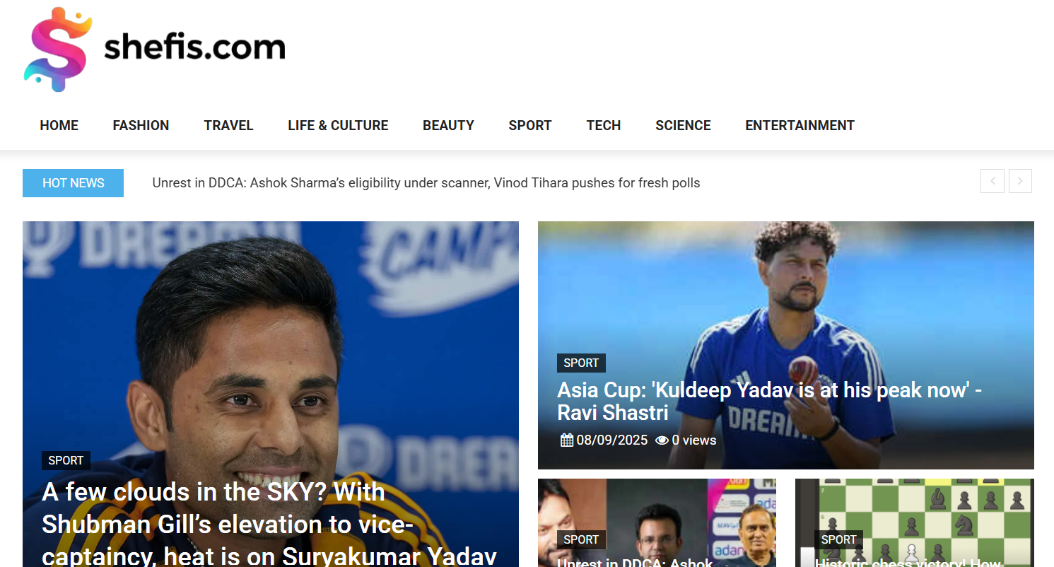 Shefis.com is strongest where public attention is already dense—tech, sports, entertainment, and globally relevant headlines. Tech articles focus on AI, APIs, software tools, cybersecurity, and digital disruption, while sports coverage is notably cricket-heavy with room for football, chess, and other popular events.