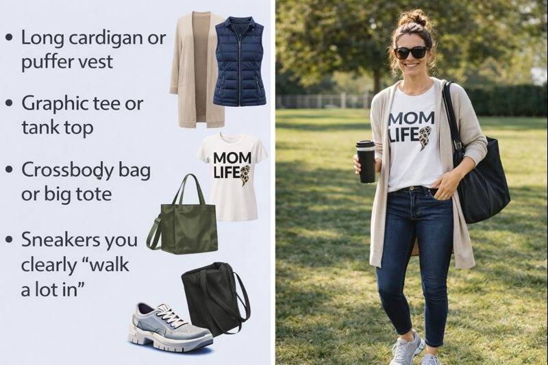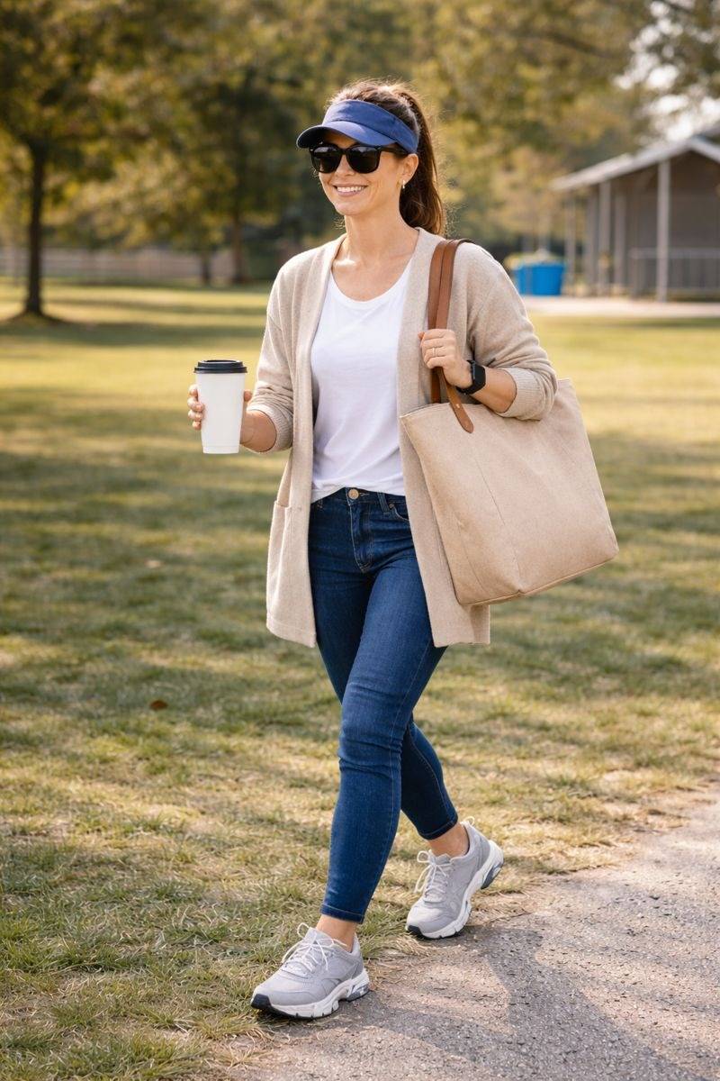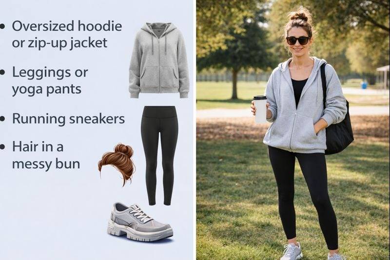 | Morning Drop-Off | Zip jacket, yoga pants | Messy bun, visor | Slightly rushed |