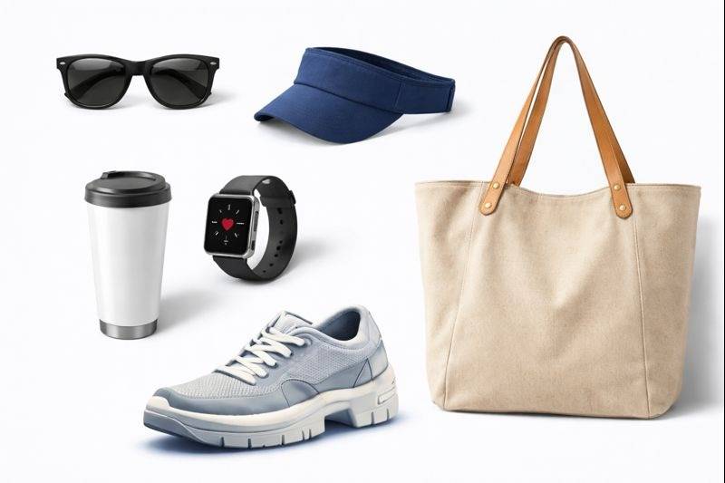 2. Accessories: Sunglasses, tote bags, coffee cups, visors