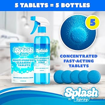 According to the brand, Splash Spray is a tablet-based cleaner: drop a tablet into water, let it dissolve, then spray the mixed solution onto surfaces like ovens, tiles, windows, or sinks. The marketing describes the formula as combining surfactants and natural enzymes to lift and break down dirt, making it easy to wipe away. The site also emphasizes that the product is “100 % natural,” free from toxic chemicals, and safe for pets and households.