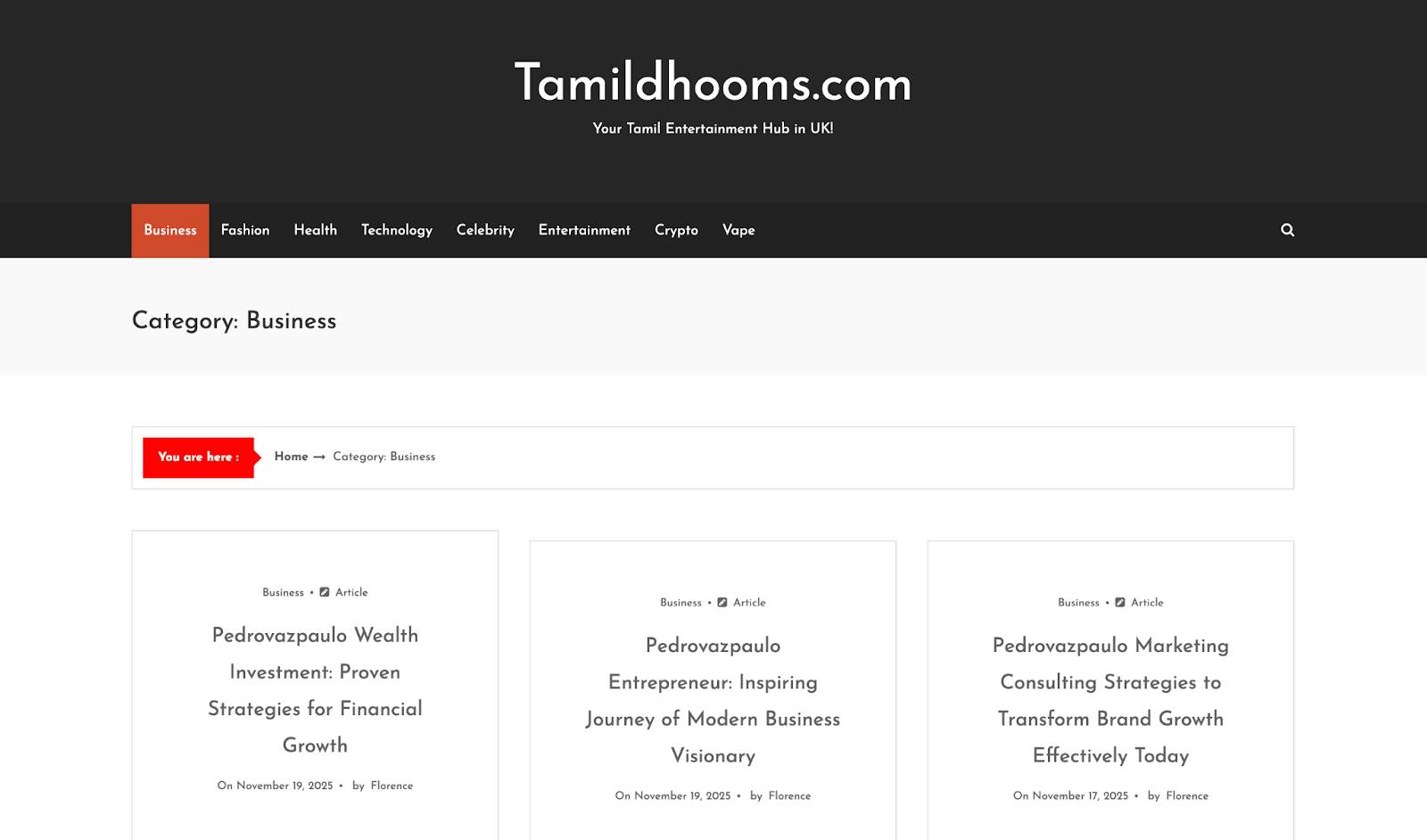 The moment you leave the introductory article, the entire identity of Tamildhooms.com changes. Instead of Tamil films or cultural segments, the site displays multiple posts about business consulting, wealth investment, marketing strategy, and personality profiles of a figure named Pedrovazpaulo. There is no Tamil entertainment content visible anywhere else on the site.