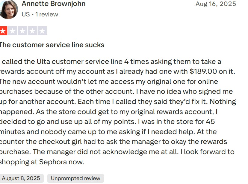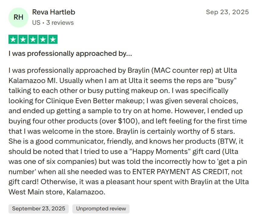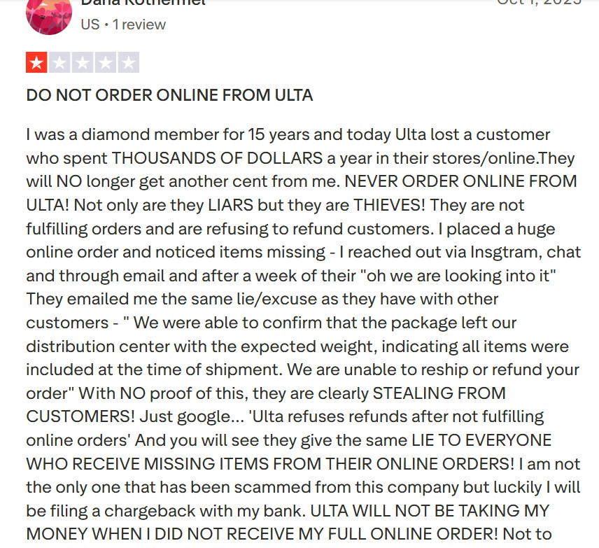 Positive: Ulta’s wide brand range and deals are a favorite for beauty fans, and staff sometimes help fix product issues quickly. Some shoppers note quick problem-solving and friendly associates, especially during in-store events or launches.