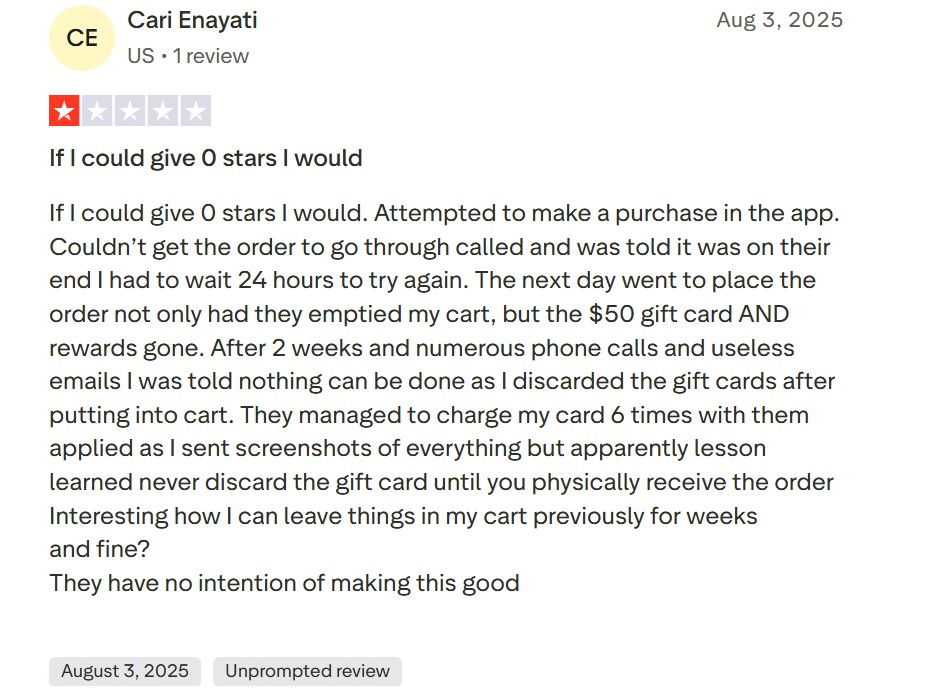 Negative: Many buyers struggle with online order problems. Reviewers describe technical website flaws, confusing order processes, delayed shipments, missing items, or even unhelpful responses to lost or returned packages. Gift card and points issues are common, with customers left frustrated by robotic, slow support that rarely resolves issues fully. Missed loyalty points, confusing policies, and missed promotions add to the irritation.