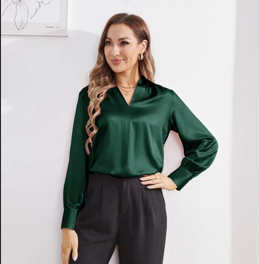 Opt for a softly structured blouse in forest green that adds a hint of color and sophistication. A round or modest V-neckline frames most faces beautifully; be sure the material lies flat against your chest and shoulders for a clean photo.
