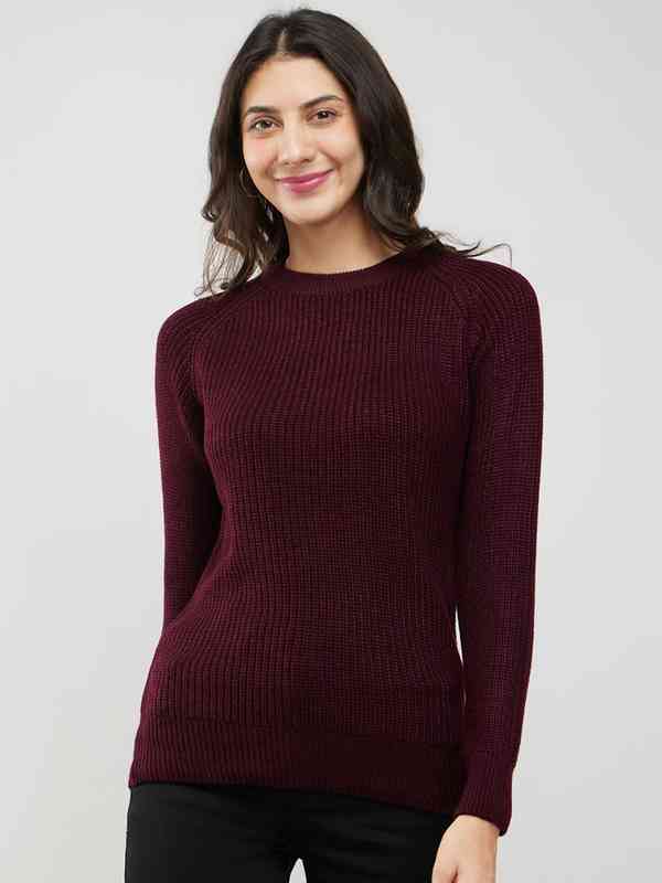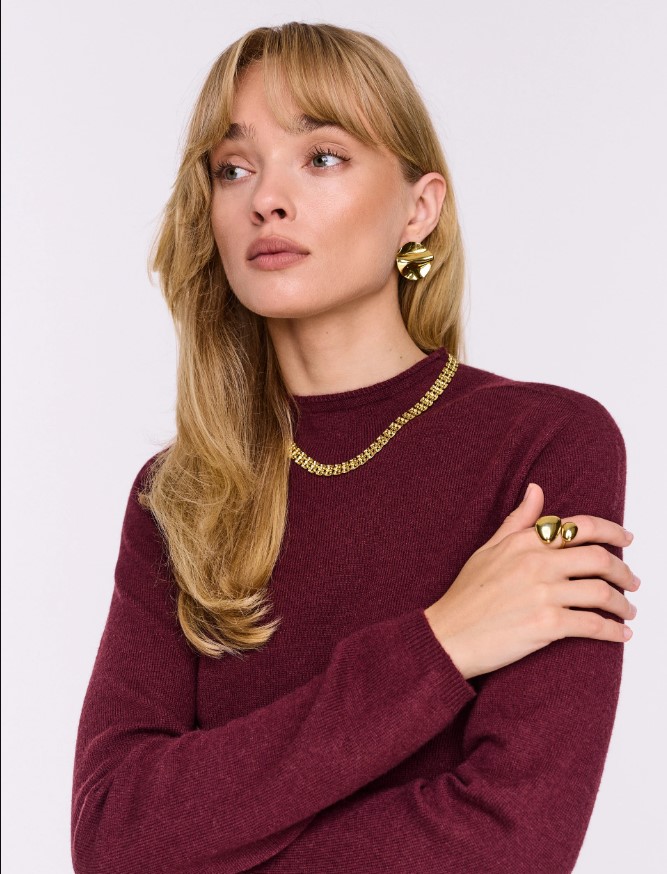 A finely knit crewneck sweater in burgundy photographs beautifully. The understated neckline draws focus to your face, while the rich color brings warmth and depth, perfect for all seasons.