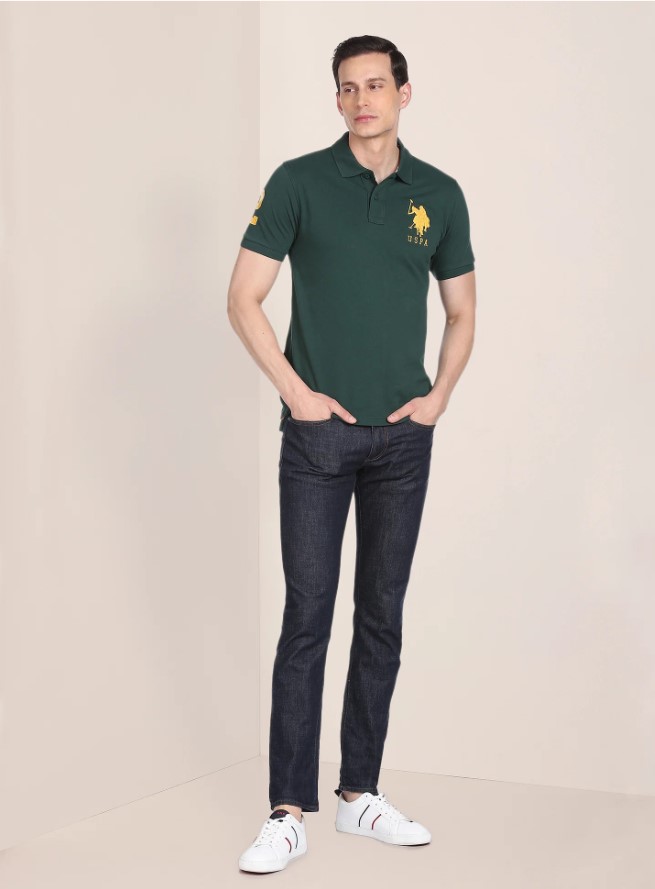 A solid, deep green polo shirt brings a soft structure to your look, especially flattering for athletic and angular faces. Keep the buttons centered and the collar flat for a timeless vibe.