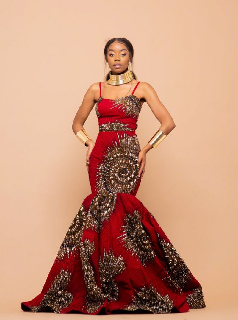 Royal blue mermaid gown with brown accents, fitted bodice, flared skirt, suitable for formal events. Fabrics likely include satin and lace, with crisscross straps highlighting the back.