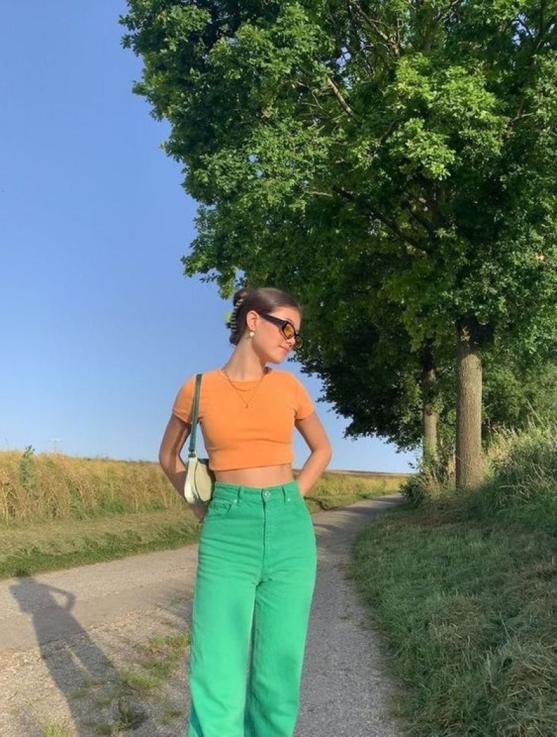 If you're looking for a fresh and vibrant look, this outfit is perfect! The orange crop top paired with high-waisted green trousers creates a bold and cheerful contrast.