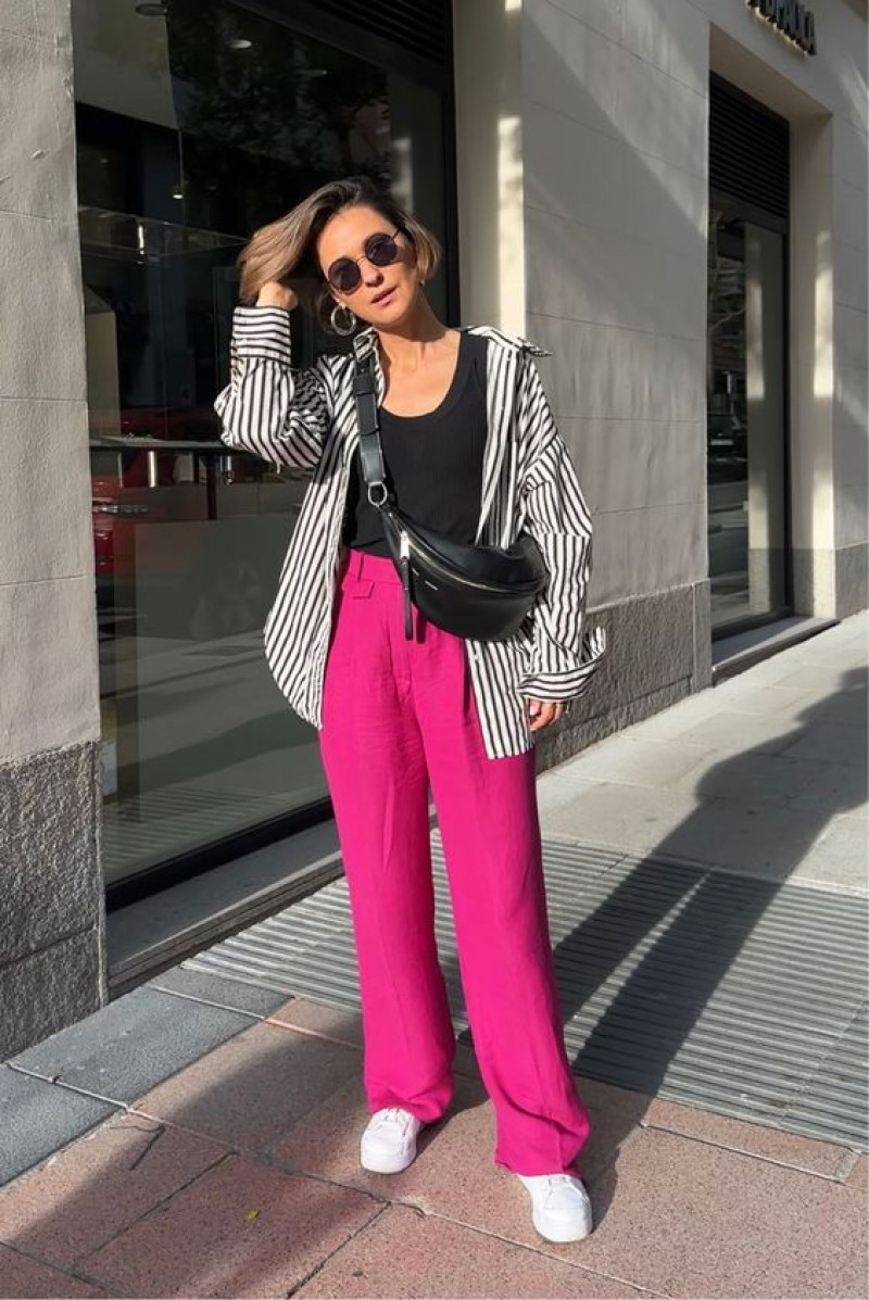 Fuchsia Trousers, Striped Blazer, Urban Fashion. Vivid fuchsia trousers with a striking black-and-white striped blazer for a bold city look. Best worn with sneakers and a minimalist crossbody bag.