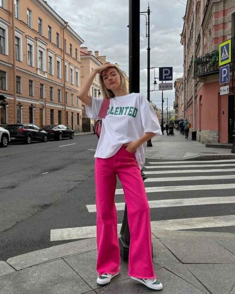 Bold white graphic tee paired with vibrant pink wide-leg pants and white sneakers, ideal for casual outings or creative meetups.