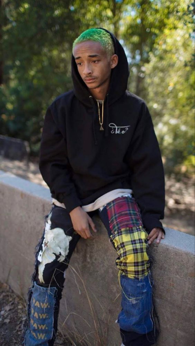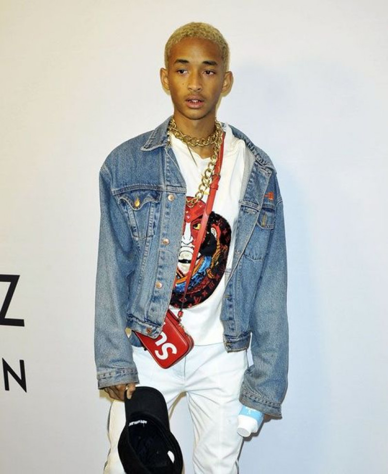 Get inspired by Jaden Smith's fashion icon status. Check out dope trends with Black t-shirts, Denim Jacket and brown trousers!