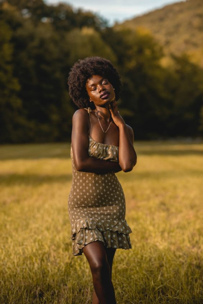 Bathed in the warm, golden light of the setting sun, she strikes a pose in a dress that mirrors the earthy tones of the fields. The dress's polka dots and ruffle hem add a playful twist to her elegant silhouette. With her head tilted back and eyes closed, she is the embodiment of relaxation and confidence, embracing the serene beauty of the twilight hour.