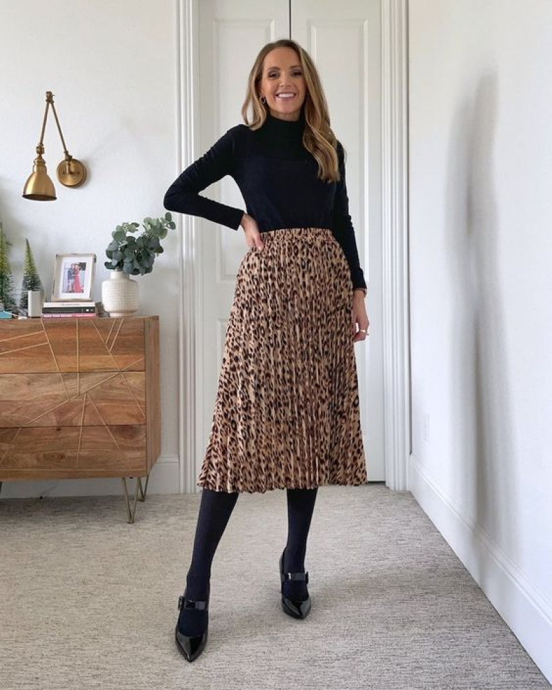 Elegant mid rise midi formal skirt skirt, black casual turtleneck neck shorted long sleeves sweater, black stockings, black elegant pump.